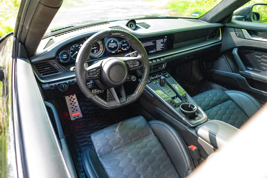 چيزي که 911 توربو اس را به 900 راکت آر تبديل مي کند تقريبا نصف به نصف بين موارد ديدني و پنهان تقسيم شده است. خودروي پايه کاملا برهنه شده و به يک کيت بدنه CFRP با 70 ميليمتر عرض بيشتر مجهز مي شود. اين افزايش عرض از آفست چرخ هاي فورج توربو ديسک مي آيد نه تغيير در تعليق، و توجه به جزئيات مشهود است. ورودي و خروجي هاي عظيم هوا در پهلوها مثل دره ها شکافته شده و داک تيل به نرمي در گلگيرهاي عقب ادغام مي شود؛ بسيار پر سر و صدا و جسور.